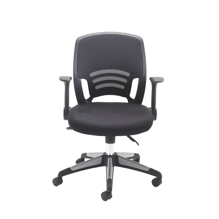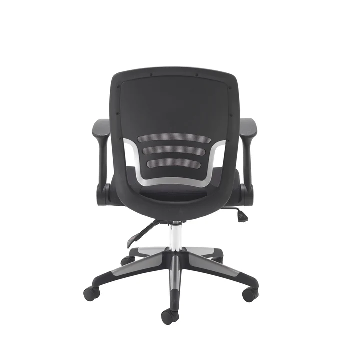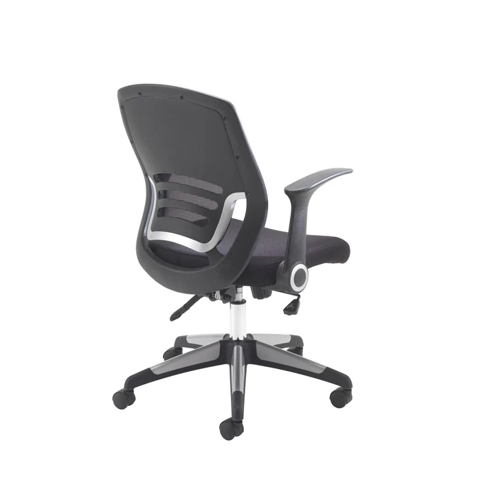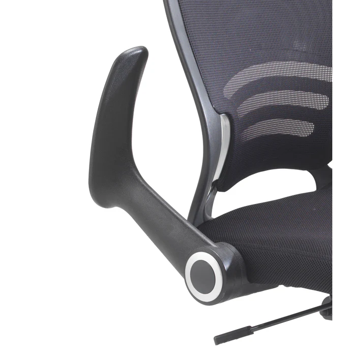 Carbon Black Mesh Office Chair with folding arms, ergonomic mesh back, and lock-tilt mechanism. Stylish black & silver base with 2-year guarantee.